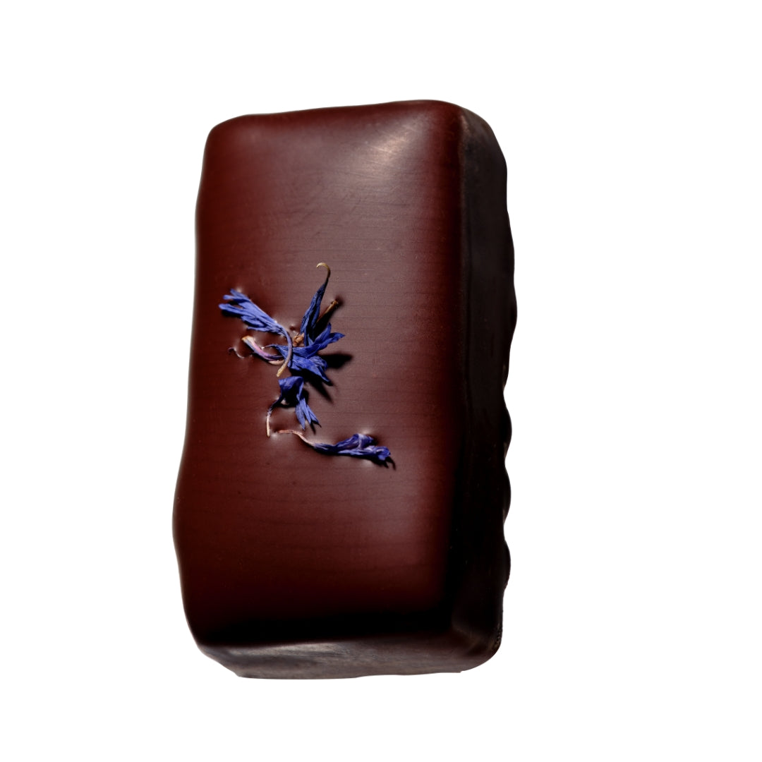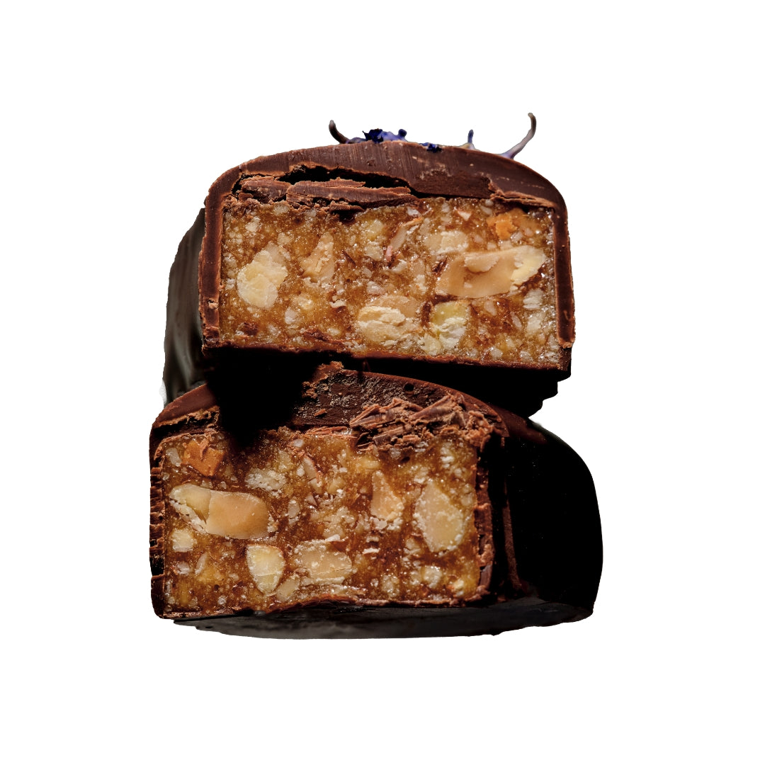 Relish in the ultimate umami experience with the salty-sweet, chewy-crunch of toasted tamari almonds folded inside gooey almond butter caramel. Wrapped in our dark Peruvian cacao, spiked with immune boosting and longevity tonic astragalus, and finished with a light garnish of brilliant blue edible cornflowers – a feast for every sense.
